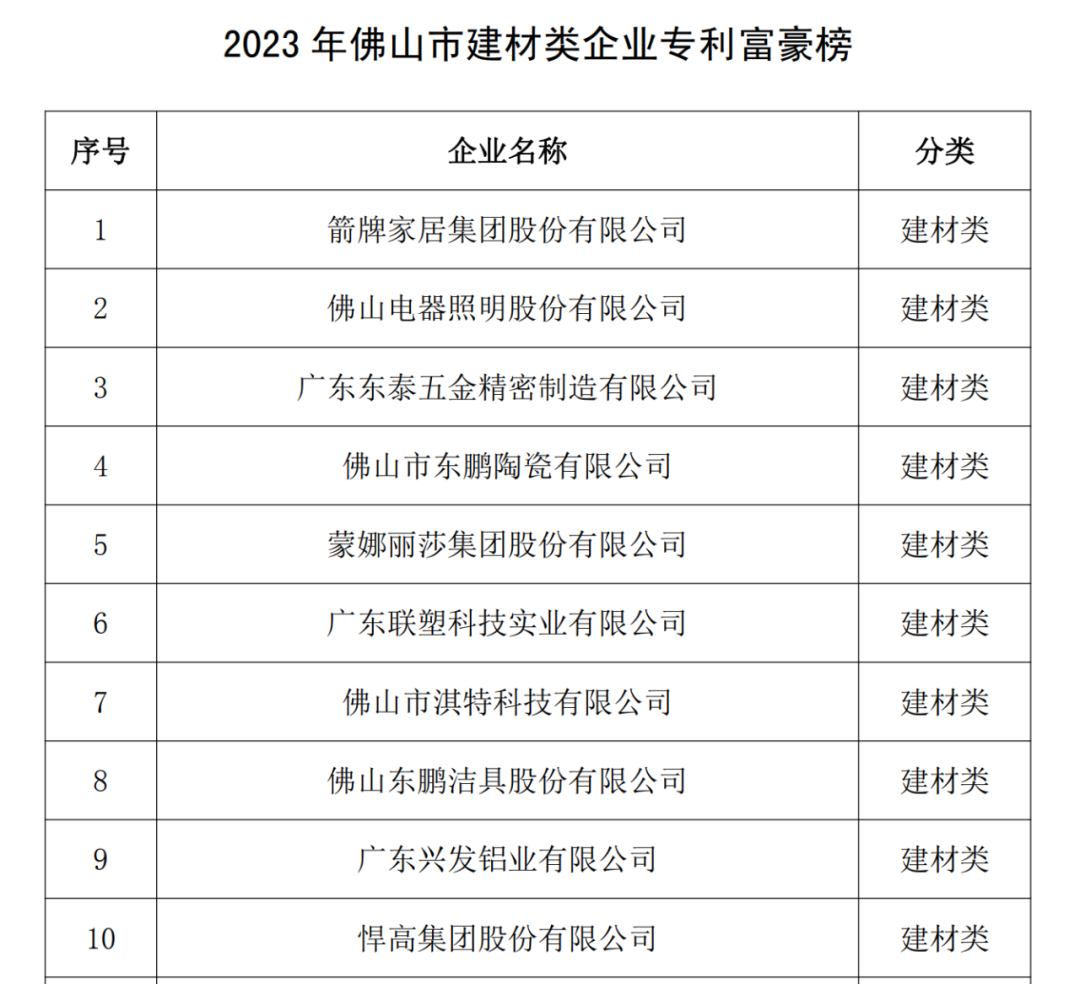4月18日,佛山市知識產(chǎn)權協(xié)會對外公布了“2023年度佛山市十大專利富豪企業(yè)”名錄,佛山市淇特科技有限公司入選“2023年度佛山市建材類企業(yè)專利富豪榜”,位列第七。